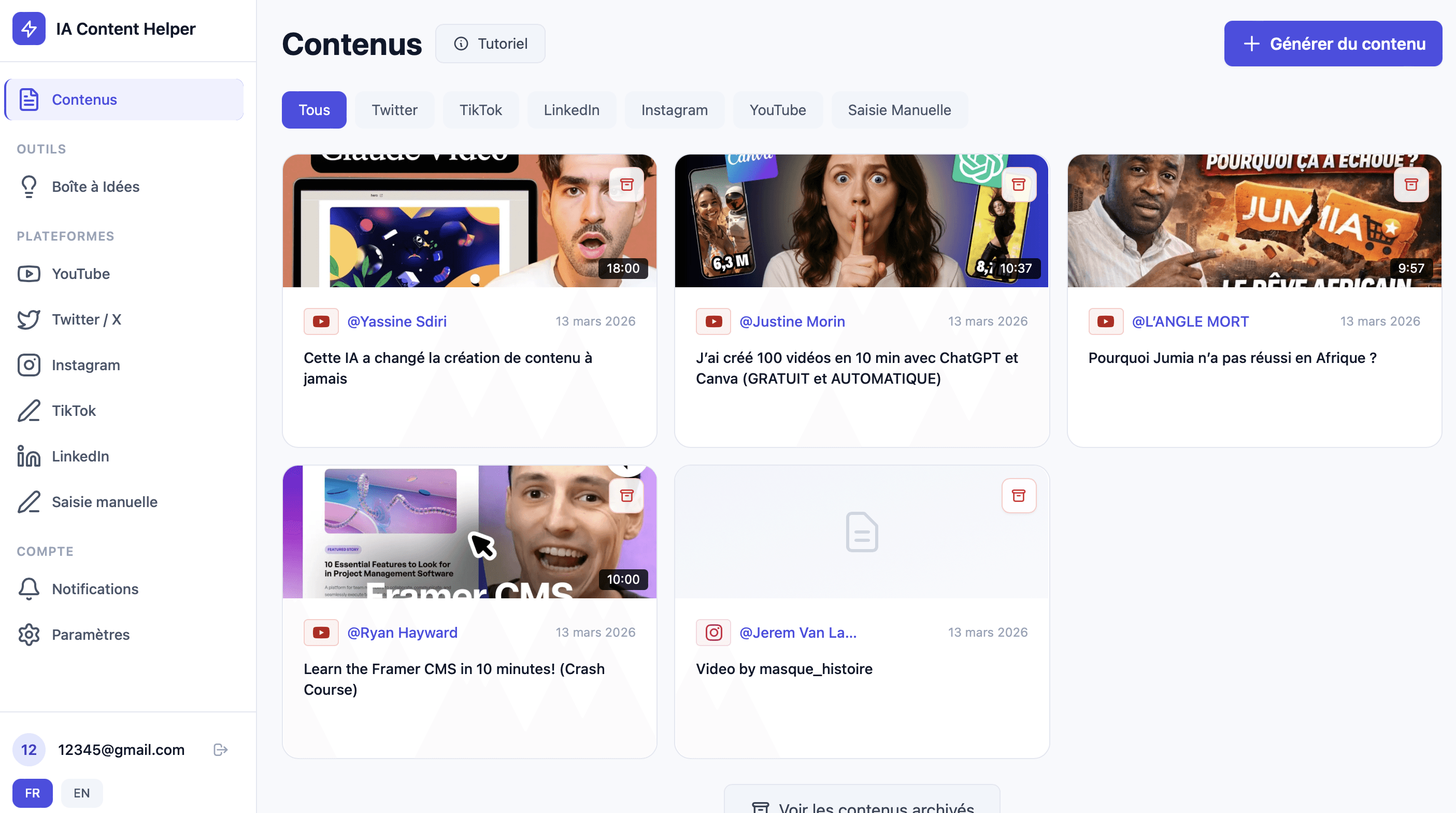 1. Génération de contenu viral par thématique — InspireLab analyse les posts qui cartonnent dans votre niche en ce moment et vous génère des idées de contenu adaptées à chaque plateforme. Vous ne partez plus de la page blanche.
